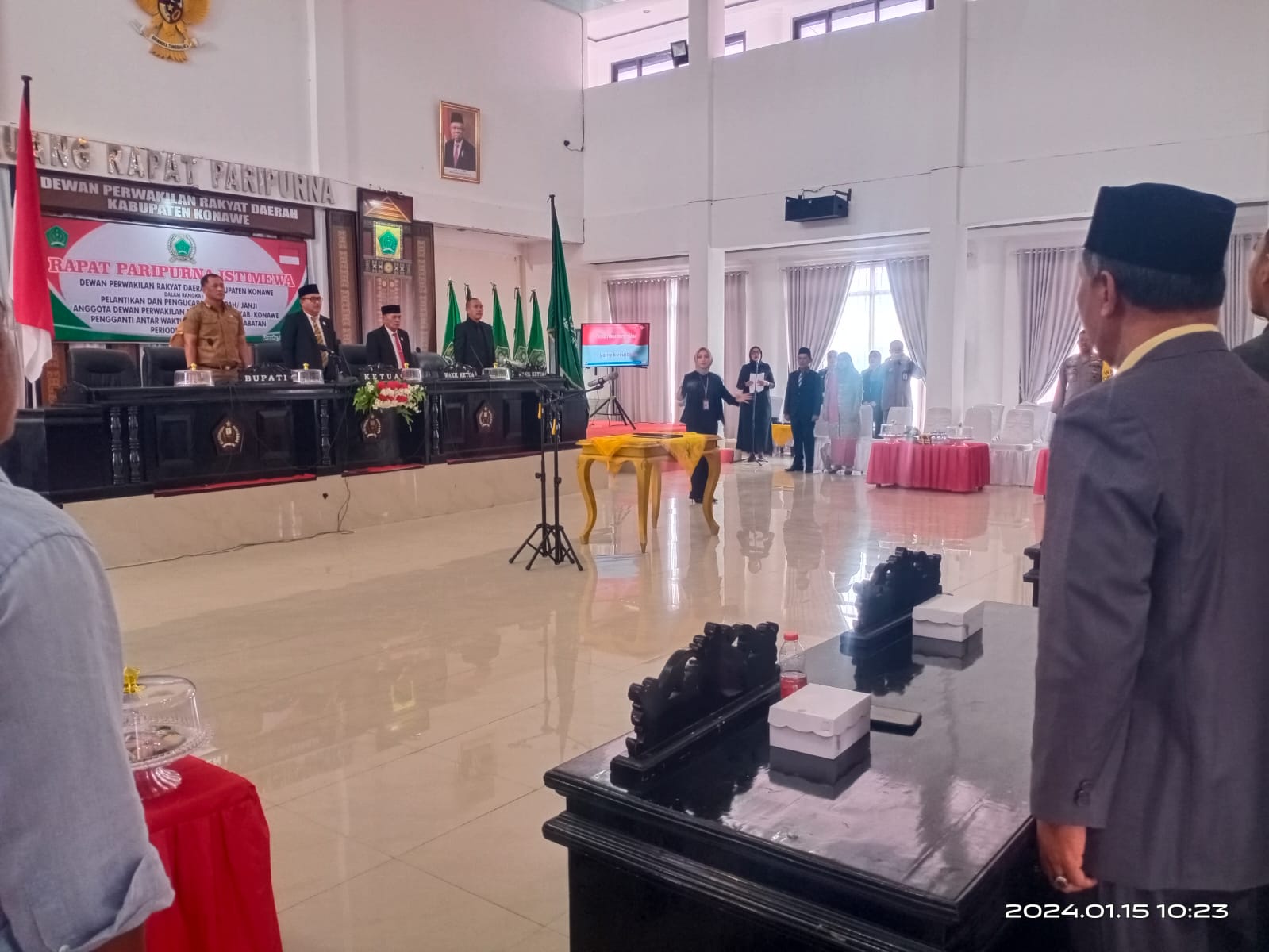 Pelantikan dilaksanakan melalui Rapat Istimewa Paripurna DPRD Kabupaten Konawe , yang dipimpin oleh Ketua DPRD, Dr. Ardin , Senin (15/1/2024).
